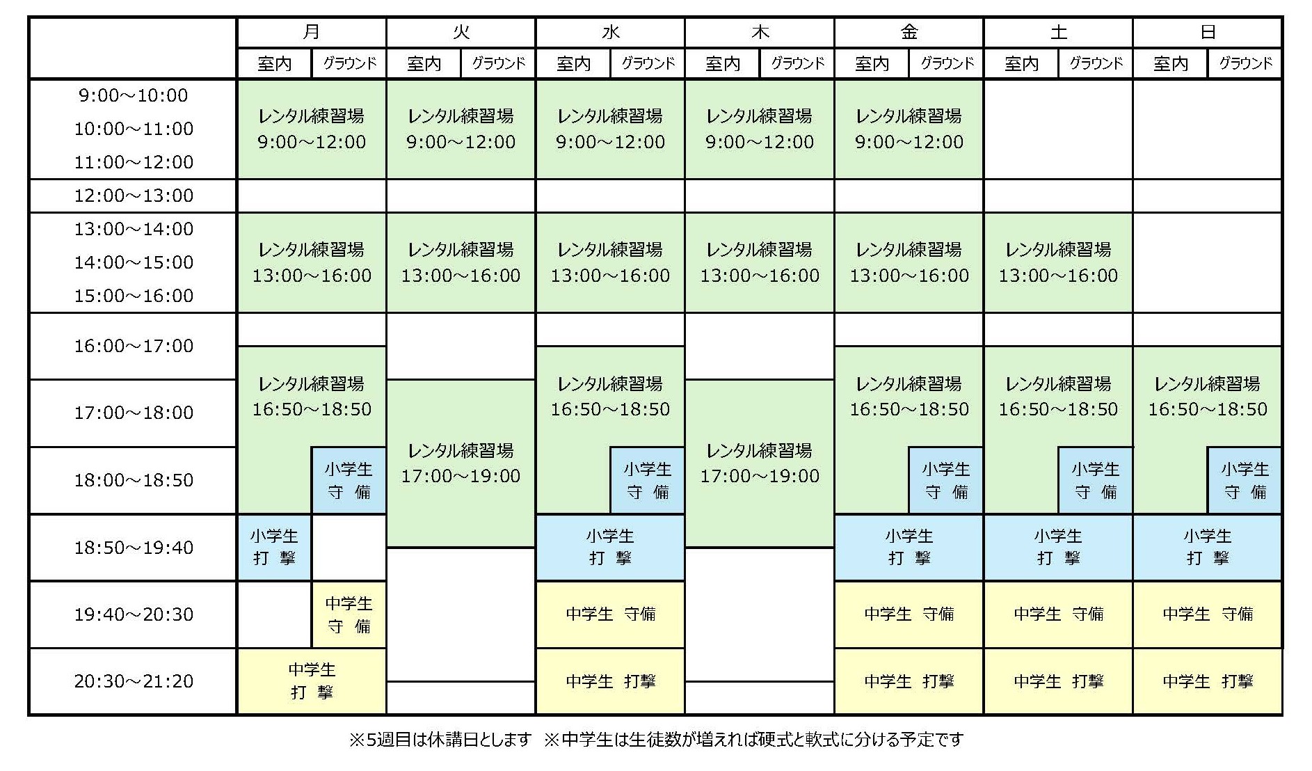 ●中学生 軟式・硬式(19:40~20:30守備 20:30~21:20打撃 100分)